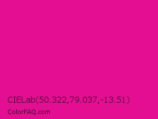 CIELab 50.322,79.037,-13.51 Color is a normal magenta color and the nearest color is Barbie Pink #e0218a. Hex code #e30e91 and RGB value is rgb(227,14,145). In RGB color space, this color is composed of 89% red, 5% green, 57% blue, In CMYK color space, this color is composed of 0% cyan, 94% magenta, 36% yellow , 11% black , In HSL color space, this color has a hue angle of 323° , 88% saturation and 47% lightness.