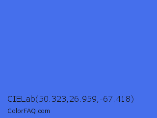 CIELab 50.323,26.959,-67.418 Color is a normal blue color and the nearest color is Royal Blue #4169e1. Hex code #456fec and RGB value is rgb(69,111,236). In RGB color space, this color is composed of 27% red, 44% green, 93% blue, In CMYK color space, this color is composed of 71% cyan, 53% magenta, 0% yellow , 7% black , In HSL color space, this color has a hue angle of 225° , 81% saturation and 60% lightness.