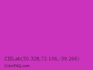 CIELab 50.328,72.106,-39.266 Color is a normal magenta color and the nearest color is Steel Pink #cc33cc. Hex code #cb33bc and RGB value is rgb(203,51,188). In RGB color space, this color is composed of 80% red, 20% green, 74% blue, In CMYK color space, this color is composed of 0% cyan, 75% magenta, 7% yellow , 20% black , In HSL color space, this color has a hue angle of 306° , 60% saturation and 50% lightness.
