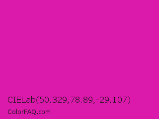 CIELab 50.329,78.89,-29.107 Color is a normal magenta color and the nearest color is Frostbite #e936a7. Hex code #db19ab and RGB value is rgb(219,25,171). In RGB color space, this color is composed of 86% red, 10% green, 67% blue, In CMYK color space, this color is composed of 0% cyan, 89% magenta, 22% yellow , 14% black , In HSL color space, this color has a hue angle of 315° , 80% saturation and 48% lightness.