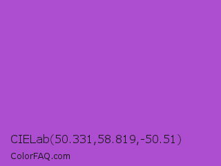CIELab 50.331,58.819,-50.51 Color is a normal purple color and the nearest color is Medium Orchid #ba55d3. Hex code #ad4dcf and RGB value is rgb(173,77,207). In RGB color space, this color is composed of 68% red, 30% green, 81% blue, In CMYK color space, this color is composed of 16% cyan, 63% magenta, 0% yellow , 19% black , In HSL color space, this color has a hue angle of 284° , 58% saturation and 56% lightness.