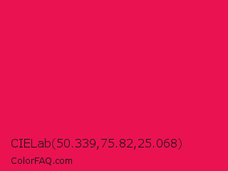 CIELab 50.339,75.82,25.068 Color is a normal rose color and the nearest color is Spanish Crimson #e51a4c. Hex code #eb1252 and RGB value is rgb(235,18,82). In RGB color space, this color is composed of 92% red, 7% green, 32% blue, In CMYK color space, this color is composed of 0% cyan, 92% magenta, 65% yellow , 8% black , In HSL color space, this color has a hue angle of 342° , 86% saturation and 50% lightness.