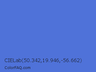 CIELab 50.342,19.946,-56.662 Color is a normal blue color and the nearest color is Han Blue #446ccf. Hex code #4f72d9 and RGB value is rgb(79,114,217). In RGB color space, this color is composed of 31% red, 45% green, 85% blue, In CMYK color space, this color is composed of 64% cyan, 47% magenta, 0% yellow , 15% black , In HSL color space, this color has a hue angle of 225° , 64% saturation and 58% lightness.