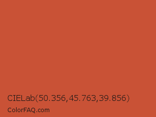 CIELab 50.356,45.763,39.856 Color is a normal red color and the nearest color is Mojo #c04737. Hex code #c95236 and RGB value is rgb(201,82,54). In RGB color space, this color is composed of 79% red, 32% green, 21% blue, In CMYK color space, this color is composed of 0% cyan, 59% magenta, 73% yellow , 21% black , In HSL color space, this color has a hue angle of 11° , 58% saturation and 50% lightness.