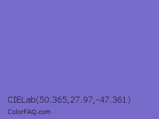 CIELab 50.365,27.97,-47.361 Color is a normal indigo color and the nearest color is Blue Marguerite #7666c6. Hex code #786bc9 and RGB value is rgb(120,107,201). In RGB color space, this color is composed of 47% red, 42% green, 79% blue, In CMYK color space, this color is composed of 40% cyan, 47% magenta, 0% yellow , 21% black , In HSL color space, this color has a hue angle of 248° , 47% saturation and 60% lightness.