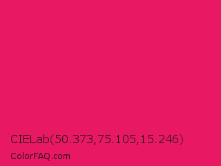 CIELab 50.373,75.105,15.246 Color is a normal rose color and the nearest color is Ruby #e0115f. Hex code #e81962 and RGB value is rgb(232,25,98). In RGB color space, this color is composed of 91% red, 10% green, 38% blue, In CMYK color space, this color is composed of 0% cyan, 89% magenta, 58% yellow , 9% black , In HSL color space, this color has a hue angle of 339° , 82% saturation and 50% lightness.