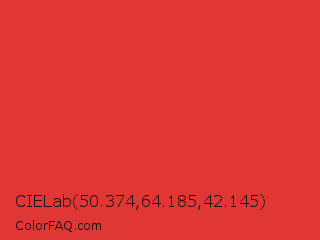 CIELab 50.374,64.185,42.145 Color is a normal red color and the nearest color is CG Red #e03c31. Hex code #e03634 and RGB value is rgb(224,54,52). In RGB color space, this color is composed of 88% red, 21% green, 20% blue, In CMYK color space, this color is composed of 0% cyan, 76% magenta, 77% yellow , 12% black , In HSL color space, this color has a hue angle of 1° , 74% saturation and 54% lightness.