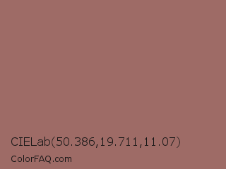 CIELab 50.386,19.711,11.07 Color is a normal red color and the nearest color is Toast #9a6e61. Hex code #9e6b66 and RGB value is rgb(158,107,102). In RGB color space, this color is composed of 62% red, 42% green, 40% blue, In CMYK color space, this color is composed of 0% cyan, 32% magenta, 35% yellow , 38% black , In HSL color space, this color has a hue angle of 5° , 22% saturation and 51% lightness.