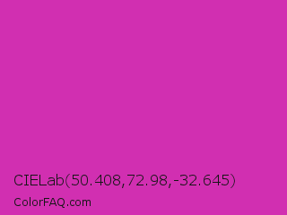 CIELab 50.408,72.98,-32.645 Color is a normal magenta color and the nearest color is Byzantine #bd33a4. Hex code #d12fb1 and RGB value is rgb(209,47,177). In RGB color space, this color is composed of 82% red, 18% green, 69% blue, In CMYK color space, this color is composed of 0% cyan, 78% magenta, 15% yellow , 18% black , In HSL color space, this color has a hue angle of 312° , 64% saturation and 50% lightness.
