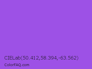 CIELab 50.412,58.394,-63.562 Color is a light purple color and the nearest color is Navy Purple #9457eb. Hex code #9d51e6 and RGB value is rgb(157,81,230). In RGB color space, this color is composed of 62% red, 32% green, 90% blue, In CMYK color space, this color is composed of 32% cyan, 65% magenta, 0% yellow , 10% black , In HSL color space, this color has a hue angle of 271° , 75% saturation and 61% lightness.