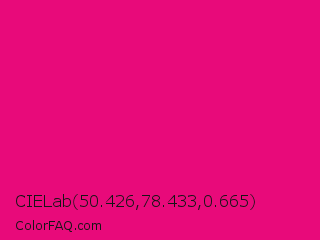 CIELab 50.426,78.433,0.665 Color is a normal rose color and the nearest color is Red Purple #e40078. Hex code #e80a7a and RGB value is rgb(232,10,122). In RGB color space, this color is composed of 91% red, 4% green, 48% blue, In CMYK color space, this color is composed of 0% cyan, 96% magenta, 47% yellow , 9% black , In HSL color space, this color has a hue angle of 330° , 92% saturation and 47% lightness.