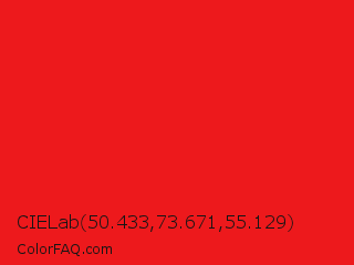 CIELab 50.433,73.671,55.129 Color is a normal red color and the nearest color is Red Pigment #ed1c24. Hex code #ed191c and RGB value is rgb(237,25,28). In RGB color space, this color is composed of 93% red, 10% green, 11% blue, In CMYK color space, this color is composed of 0% cyan, 89% magenta, 88% yellow , 7% black , In HSL color space, this color has a hue angle of 359° , 85% saturation and 51% lightness.