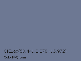 CIELab 50.441,2.278,-15.972 Color is a normal blue color and the nearest color is Slate Gray #708090. Hex code #6d7893 and RGB value is rgb(109,120,147). In RGB color space, this color is composed of 43% red, 47% green, 58% blue, In CMYK color space, this color is composed of 26% cyan, 18% magenta, 0% yellow , 42% black , In HSL color space, this color has a hue angle of 223° , 15% saturation and 50% lightness.