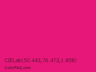CIELab 50.443,76.473,1.858 Color is a normal rose color and the nearest color is Vivid Cerise #da1d81. Hex code #e61778 and RGB value is rgb(230,23,120). In RGB color space, this color is composed of 90% red, 9% green, 47% blue, In CMYK color space, this color is composed of 0% cyan, 90% magenta, 48% yellow , 10% black , In HSL color space, this color has a hue angle of 332° , 82% saturation and 50% lightness.