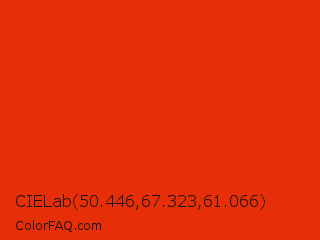 CIELab 50.446,67.323,61.066 Color is a normal red color and the nearest color is Ferrari Red #ff2800. Hex code #e62e08 and RGB value is rgb(230,46,8). In RGB color space, this color is composed of 90% red, 18% green, 3% blue, In CMYK color space, this color is composed of 0% cyan, 80% magenta, 97% yellow , 10% black , In HSL color space, this color has a hue angle of 10° , 93% saturation and 47% lightness.