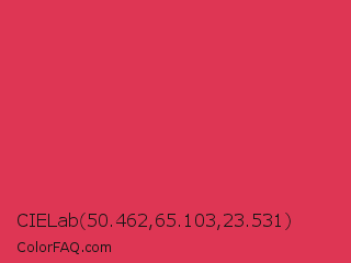 CIELab 50.462,65.103,23.531 Color is a normal red color and the nearest color is Desire #ea3c53. Hex code #de3654 and RGB value is rgb(222,54,84). In RGB color space, this color is composed of 87% red, 21% green, 33% blue, In CMYK color space, this color is composed of 0% cyan, 76% magenta, 62% yellow , 13% black , In HSL color space, this color has a hue angle of 349° , 72% saturation and 54% lightness.