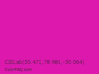 CIELab 50.471,78.981,-30.064 Color is a normal magenta color and the nearest color is Frostbite #e936a7. Hex code #db1aad and RGB value is rgb(219,26,173). In RGB color space, this color is composed of 86% red, 10% green, 68% blue, In CMYK color space, this color is composed of 0% cyan, 88% magenta, 21% yellow , 14% black , In HSL color space, this color has a hue angle of 314° , 79% saturation and 48% lightness.
