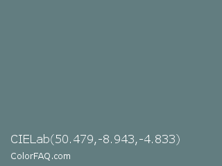 CIELab 50.479,-8.943,-4.833 Color is a normal cyan color and the nearest color is Aurometalsaurus #6e7f80. Hex code #627d80 and RGB value is rgb(98,125,128). In RGB color space, this color is composed of 38% red, 49% green, 50% blue, In CMYK color space, this color is composed of 23% cyan, 2% magenta, 0% yellow , 50% black , In HSL color space, this color has a hue angle of 186° , 13% saturation and 44% lightness.