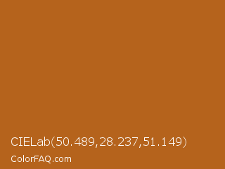 CIELab 50.489,28.237,51.149 Color is a normal orange color and the nearest color is Light Brown #b5651d. Hex code #b5631c and RGB value is rgb(181,99,28). In RGB color space, this color is composed of 71% red, 39% green, 11% blue, In CMYK color space, this color is composed of 0% cyan, 45% magenta, 85% yellow , 29% black , In HSL color space, this color has a hue angle of 28° , 73% saturation and 41% lightness.