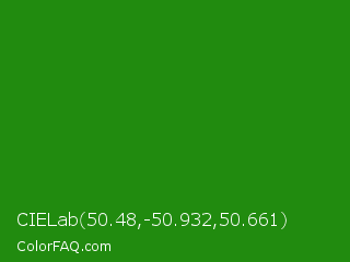 CIELab 50.48,-50.932,50.661 Color is a dark green color and the nearest color is Slimy Green #299617. Hex code #218b0f and RGB value is rgb(33,139,15). In RGB color space, this color is composed of 13% red, 55% green, 6% blue, In CMYK color space, this color is composed of 76% cyan, 0% magenta, 89% yellow , 45% black , In HSL color space, this color has a hue angle of 111° , 81% saturation and 30% lightness.