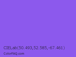 CIELab 50.493,52.585,-67.461 Color is a light violet color and the nearest color is Navy Purple #9457eb. Hex code #8c59ed and RGB value is rgb(140,89,237). In RGB color space, this color is composed of 55% red, 35% green, 93% blue, In CMYK color space, this color is composed of 41% cyan, 62% magenta, 0% yellow , 7% black , In HSL color space, this color has a hue angle of 261° , 80% saturation and 64% lightness.