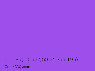 CIELab 50.522,60.71,-66.195 Color is a light violet color and the nearest color is Navy Purple #9457eb. Hex code #9e4feb and RGB value is rgb(158,79,235). In RGB color space, this color is composed of 62% red, 31% green, 92% blue, In CMYK color space, this color is composed of 33% cyan, 66% magenta, 0% yellow , 8% black , In HSL color space, this color has a hue angle of 270° , 80% saturation and 62% lightness.