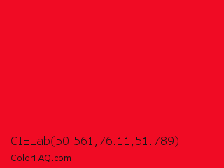 CIELab 50.561,76.11,51.789 Color is a normal red color and the nearest color is Vivid Red #f70d1a. Hex code #f00b24 and RGB value is rgb(240,11,36). In RGB color space, this color is composed of 94% red, 4% green, 14% blue, In CMYK color space, this color is composed of 0% cyan, 95% magenta, 85% yellow , 6% black , In HSL color space, this color has a hue angle of 353° , 91% saturation and 49% lightness.