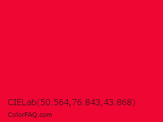 CIELab 50.564,76.843,43.868 Color is a normal red color and the nearest color is Red Munsell #f2003c. Hex code #f00633 and RGB value is rgb(240,6,51). In RGB color space, this color is composed of 94% red, 2% green, 20% blue, In CMYK color space, this color is composed of 0% cyan, 98% magenta, 79% yellow , 6% black , In HSL color space, this color has a hue angle of 348° , 95% saturation and 48% lightness.