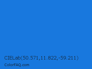 CIELab 50.571,11.822,-59.211 Color is a normal blue color and the nearest color is Bright Navy Blue #1974d2. Hex code #1878de and RGB value is rgb(24,120,222). In RGB color space, this color is composed of 9% red, 47% green, 87% blue, In CMYK color space, this color is composed of 89% cyan, 46% magenta, 0% yellow , 13% black , In HSL color space, this color has a hue angle of 211° , 80% saturation and 48% lightness.