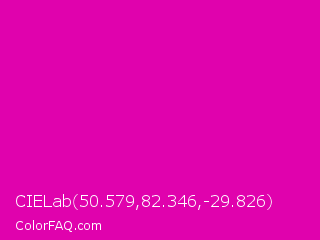 CIELab 50.579,82.346,-29.826 Color is a normal magenta color and the nearest color is Hollywood Cerise #f400a1. Hex code #e002ad and RGB value is rgb(224,2,173). In RGB color space, this color is composed of 88% red, 1% green, 68% blue, In CMYK color space, this color is composed of 0% cyan, 99% magenta, 23% yellow , 12% black , In HSL color space, this color has a hue angle of 314° , 98% saturation and 44% lightness.