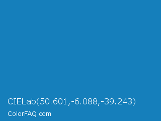 CIELab 50.601,-6.088,-39.243 Color is a normal blue color and the nearest color is Cyan Cornflower Blue #188bc2. Hex code #157fbb and RGB value is rgb(21,127,187). In RGB color space, this color is composed of 8% red, 50% green, 73% blue, In CMYK color space, this color is composed of 89% cyan, 32% magenta, 0% yellow , 27% black , In HSL color space, this color has a hue angle of 202° , 80% saturation and 41% lightness.