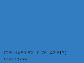 CIELab 50.621,0.76,-42.613 Color is a normal blue color and the nearest color is Cyan Blue Azure #4682bf. Hex code #327cc1 and RGB value is rgb(50,124,193). In RGB color space, this color is composed of 20% red, 49% green, 76% blue, In CMYK color space, this color is composed of 74% cyan, 36% magenta, 0% yellow , 24% black , In HSL color space, this color has a hue angle of 209° , 59% saturation and 48% lightness.
