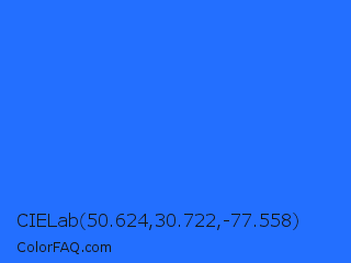 CIELab 50.624,30.722,-77.558 Color is a normal blue color and the nearest color is Blue Crayola #1f75fe. Hex code #236fff and RGB value is rgb(35,111,255). In RGB color space, this color is composed of 14% red, 44% green, 100% blue, In CMYK color space, this color is composed of 86% cyan, 56% magenta, 0% yellow , 0% black , In HSL color space, this color has a hue angle of 219° , 100% saturation and 57% lightness.
