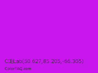 CIELab 50.627,85.205,-66.305 Color is a normal purple color and the nearest color is Vivid Mulberry #b80ce3. Hex code #c817ec and RGB value is rgb(200,23,236). In RGB color space, this color is composed of 78% red, 9% green, 93% blue, In CMYK color space, this color is composed of 15% cyan, 90% magenta, 0% yellow , 7% black , In HSL color space, this color has a hue angle of 290° , 85% saturation and 51% lightness.