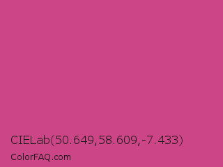 CIELab 50.649,58.609,-7.433 Color is a normal rose color and the nearest color is Smitten #c84186. Hex code #cc4687 and RGB value is rgb(204,70,135). In RGB color space, this color is composed of 80% red, 27% green, 53% blue, In CMYK color space, this color is composed of 0% cyan, 66% magenta, 34% yellow , 20% black , In HSL color space, this color has a hue angle of 331° , 57% saturation and 54% lightness.