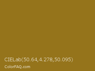 CIELab 50.64,4.278,50.095 Color is a normal orange color and the nearest color is Sand Dune #967117. Hex code #95741b and RGB value is rgb(149,116,27). In RGB color space, this color is composed of 58% red, 45% green, 11% blue, In CMYK color space, this color is composed of 0% cyan, 22% magenta, 82% yellow , 42% black , In HSL color space, this color has a hue angle of 44° , 69% saturation and 35% lightness.
