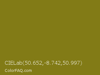 CIELab 50.652,-8.742,50.997 Color is a dark yellow color and the nearest color is Trendy Green #7c881a. Hex code #827b16 and RGB value is rgb(130,123,22). In RGB color space, this color is composed of 51% red, 48% green, 9% blue, In CMYK color space, this color is composed of 0% cyan, 5% magenta, 83% yellow , 49% black , In HSL color space, this color has a hue angle of 56° , 71% saturation and 30% lightness.