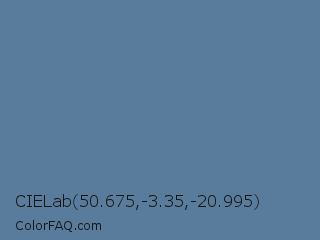 CIELab 50.675,-3.35,-20.995 Color is a normal blue color and the nearest color is Horizon #5a87a0. Hex code #5a7c9c and RGB value is rgb(90,124,156). In RGB color space, this color is composed of 35% red, 49% green, 61% blue, In CMYK color space, this color is composed of 42% cyan, 21% magenta, 0% yellow , 39% black , In HSL color space, this color has a hue angle of 209° , 27% saturation and 48% lightness.