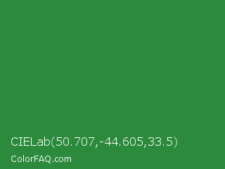 CIELab 50.707,-44.605,33.5 Color is a normal green color and the nearest color is Sea Green #2e8b57. Hex code #2b8a3c and RGB value is rgb(43,138,60). In RGB color space, this color is composed of 17% red, 54% green, 24% blue, In CMYK color space, this color is composed of 69% cyan, 0% magenta, 57% yellow , 46% black , In HSL color space, this color has a hue angle of 131° , 52% saturation and 35% lightness.