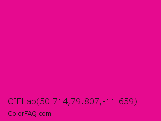 CIELab 50.714,79.807,-11.659 Color is a normal magenta color and the nearest color is Mexican Pink #e4007c. Hex code #e60a8f and RGB value is rgb(230,10,143). In RGB color space, this color is composed of 90% red, 4% green, 56% blue, In CMYK color space, this color is composed of 0% cyan, 96% magenta, 38% yellow , 10% black , In HSL color space, this color has a hue angle of 324° , 92% saturation and 47% lightness.