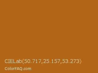 CIELab 50.717,25.157,53.273 Color is a normal orange color and the nearest color is Light Brown #b5651d. Hex code #b26616 and RGB value is rgb(178,102,22). In RGB color space, this color is composed of 70% red, 40% green, 9% blue, In CMYK color space, this color is composed of 0% cyan, 43% magenta, 88% yellow , 30% black , In HSL color space, this color has a hue angle of 31° , 78% saturation and 39% lightness.