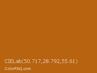 CIELab 50.717,28.792,55.61 Color is a normal orange color and the nearest color is Pumpkin Skin #b1610b. Hex code #b7630f and RGB value is rgb(183,99,15). In RGB color space, this color is composed of 72% red, 39% green, 6% blue, In CMYK color space, this color is composed of 0% cyan, 46% magenta, 92% yellow , 28% black , In HSL color space, this color has a hue angle of 30° , 85% saturation and 39% lightness.