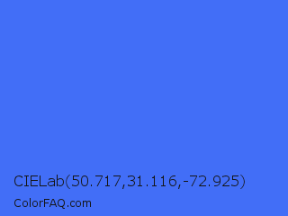 CIELab 50.717,31.116,-72.925 Color is a light blue color and the nearest color is Ultramarine Blue #4166f5. Hex code #426ef7 and RGB value is rgb(66,110,247). In RGB color space, this color is composed of 26% red, 43% green, 97% blue, In CMYK color space, this color is composed of 73% cyan, 55% magenta, 0% yellow , 3% black , In HSL color space, this color has a hue angle of 225° , 92% saturation and 61% lightness.