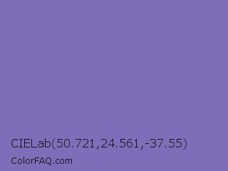 CIELab 50.721,24.561,-37.55 Color is a normal indigo color and the nearest color is Middle Blue Purple #8b72be. Hex code #806db9 and RGB value is rgb(128,109,185). In RGB color space, this color is composed of 50% red, 43% green, 73% blue, In CMYK color space, this color is composed of 31% cyan, 41% magenta, 0% yellow , 27% black , In HSL color space, this color has a hue angle of 255° , 35% saturation and 58% lightness.