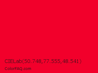 CIELab 50.748,77.555,48.541 Color is a normal red color and the nearest color is Spanish Red #e60026. Hex code #f2002b and RGB value is rgb(242,0,43). In RGB color space, this color is composed of 95% red, 0% green, 17% blue, In CMYK color space, this color is composed of 0% cyan, 100% magenta, 82% yellow , 5% black , In HSL color space, this color has a hue angle of 349° , 100% saturation and 47% lightness.