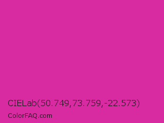 CIELab 50.749,73.759,-22.573 Color is a normal magenta color and the nearest color is Frostbite #e936a7. Hex code #d92ba1 and RGB value is rgb(217,43,161). In RGB color space, this color is composed of 85% red, 17% green, 63% blue, In CMYK color space, this color is composed of 0% cyan, 80% magenta, 26% yellow , 15% black , In HSL color space, this color has a hue angle of 319° , 70% saturation and 51% lightness.
