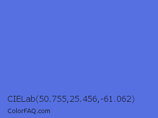 CIELab 50.755,25.456,-61.062 Color is a light blue color and the nearest color is Royal Blue #4169e1. Hex code #5670e2 and RGB value is rgb(86,112,226). In RGB color space, this color is composed of 34% red, 44% green, 89% blue, In CMYK color space, this color is composed of 62% cyan, 50% magenta, 0% yellow , 11% black , In HSL color space, this color has a hue angle of 229° , 71% saturation and 61% lightness.