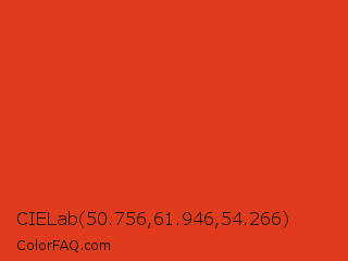 CIELab 50.756,61.946,54.266 Color is a normal red color and the nearest color is Vermilion #d9381e. Hex code #e03b1c and RGB value is rgb(224,59,28). In RGB color space, this color is composed of 88% red, 23% green, 11% blue, In CMYK color space, this color is composed of 0% cyan, 74% magenta, 88% yellow , 12% black , In HSL color space, this color has a hue angle of 9° , 78% saturation and 49% lightness.