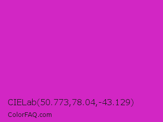 CIELab 50.773,78.04,-43.129 Color is a normal magenta color and the nearest color is Steel Pink #cc33cc. Hex code #d226c4 and RGB value is rgb(210,38,196). In RGB color space, this color is composed of 82% red, 15% green, 77% blue, In CMYK color space, this color is composed of 0% cyan, 82% magenta, 7% yellow , 18% black , In HSL color space, this color has a hue angle of 305° , 69% saturation and 49% lightness.