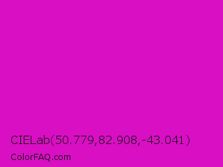 CIELab 50.779,82.908,-43.041 Color is a normal magenta color and the nearest color is Deep Magenta #cc00cc. Hex code #d90fc4 and RGB value is rgb(217,15,196). In RGB color space, this color is composed of 85% red, 6% green, 77% blue, In CMYK color space, this color is composed of 0% cyan, 93% magenta, 10% yellow , 15% black , In HSL color space, this color has a hue angle of 306° , 87% saturation and 45% lightness.